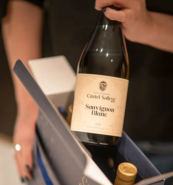 Nobilis, Serenis, Imperialis – they’re all here at the Vineria wine bar where Castel Sallegg wines are displayed. With an elegant atmosphere, these historical rooms belonging to the Leisenhof estate exude beauty and style. Custom-made shelves display the current wines, while special bottles and rarities are showcased in the wine library. Comfortable niches, a parlour, and a loggia for guided orindividual tastings. Andreas grew up in this area and has roots here – he and his team have a lot of know-how and will be delighted to assist and advise you.